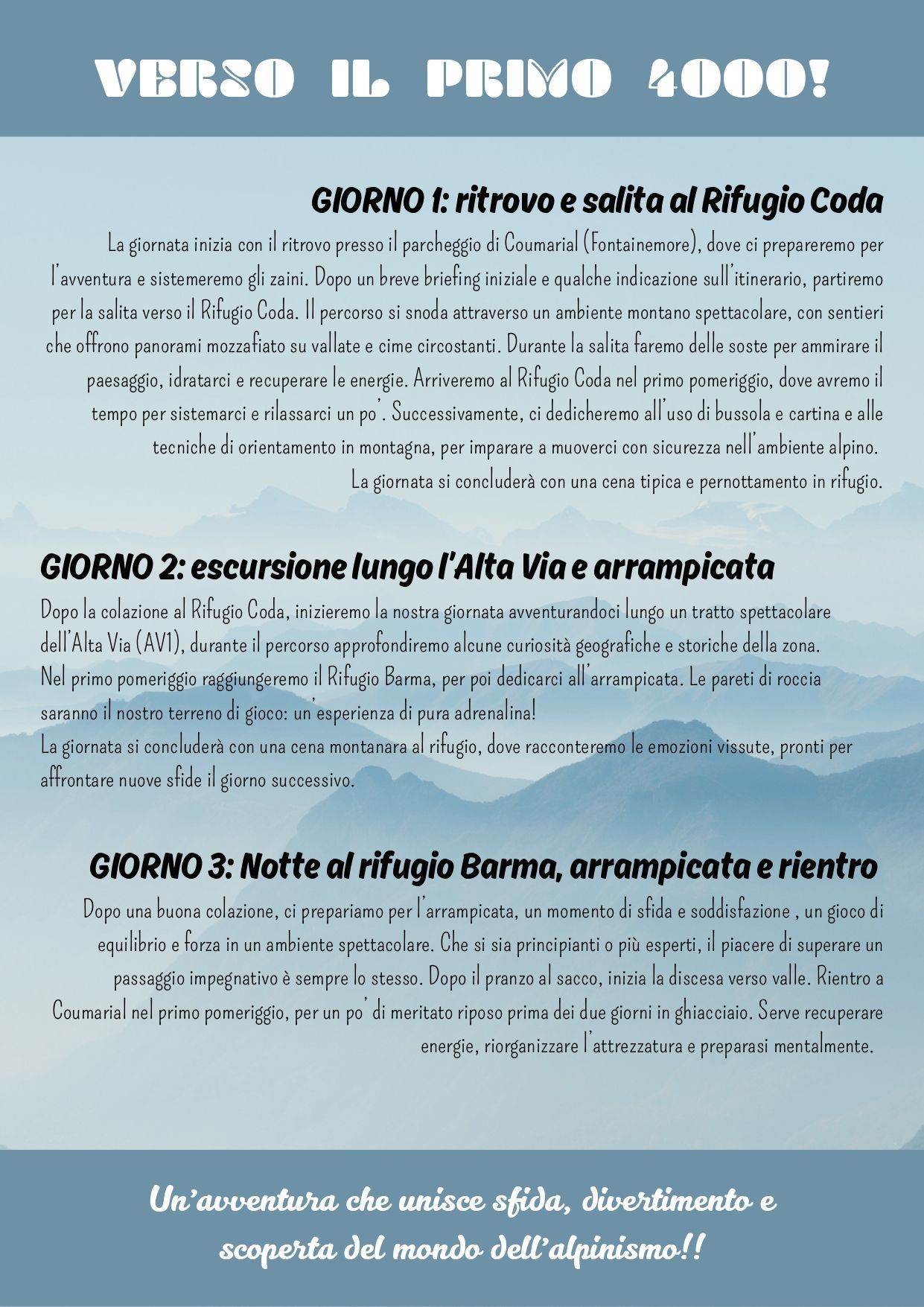 Qui di seguito puoi trovare le varie attivitá ed esperienze proposte proposte, accompagnati da un'accurata descrizione e le date.